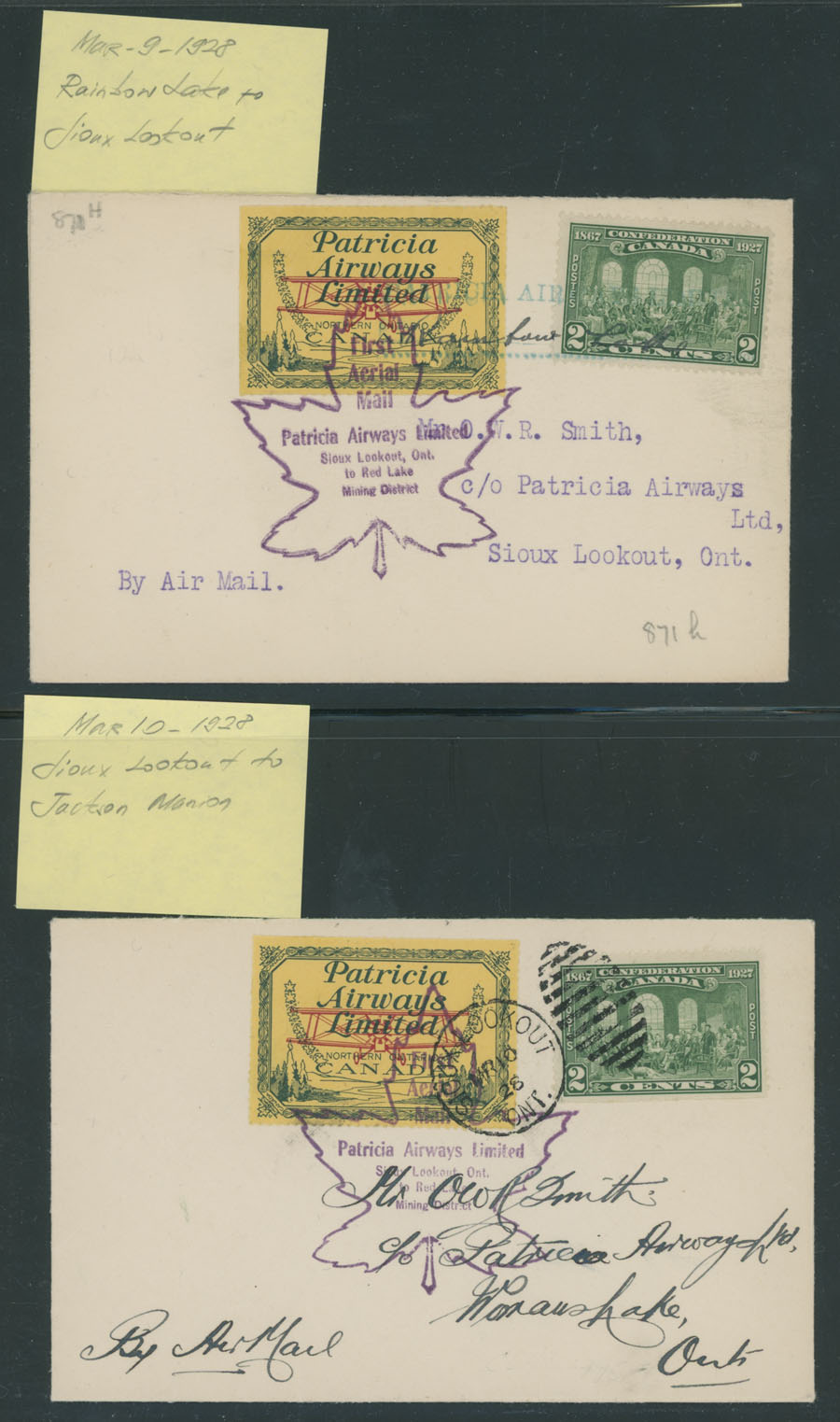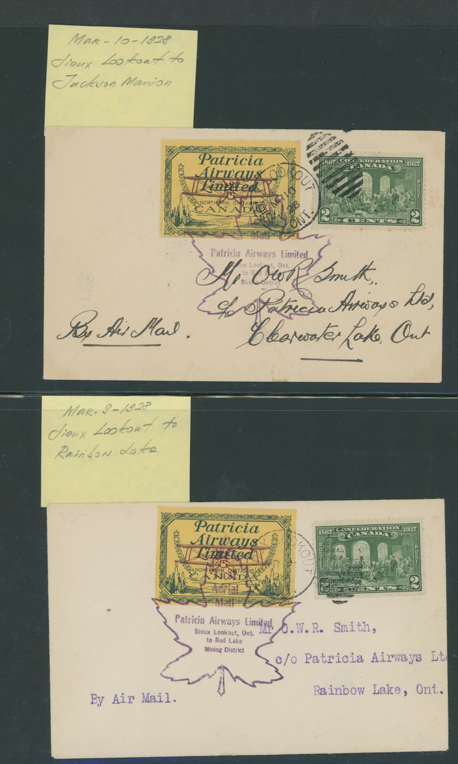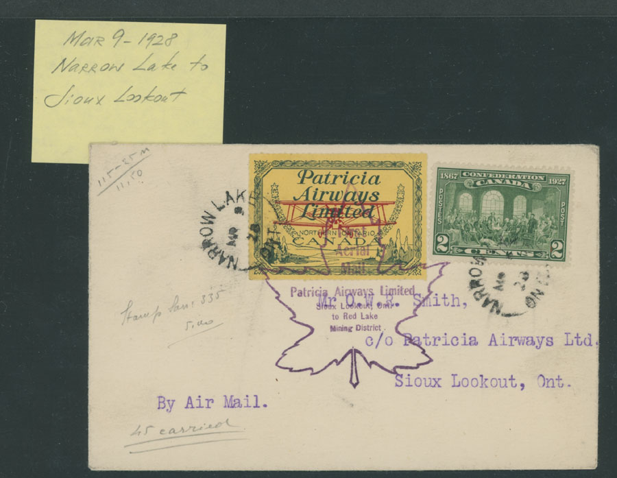 1928 (March 9-10), Patricia Airways Limited, group of 11 different Direct and Return flights from/to Sioux Lookout, itineraries includes Gold Pines, Red Lake, Jackson Manion, Rainbow Lake and etc., franked by 2c postage and bearing (10c) green and red on yellow paper, confirmation marking in violet, all with arrival ds, mostly VF, Unitrade C.v. CAD$1,925, Est. $800-$900, Scott #CL43
