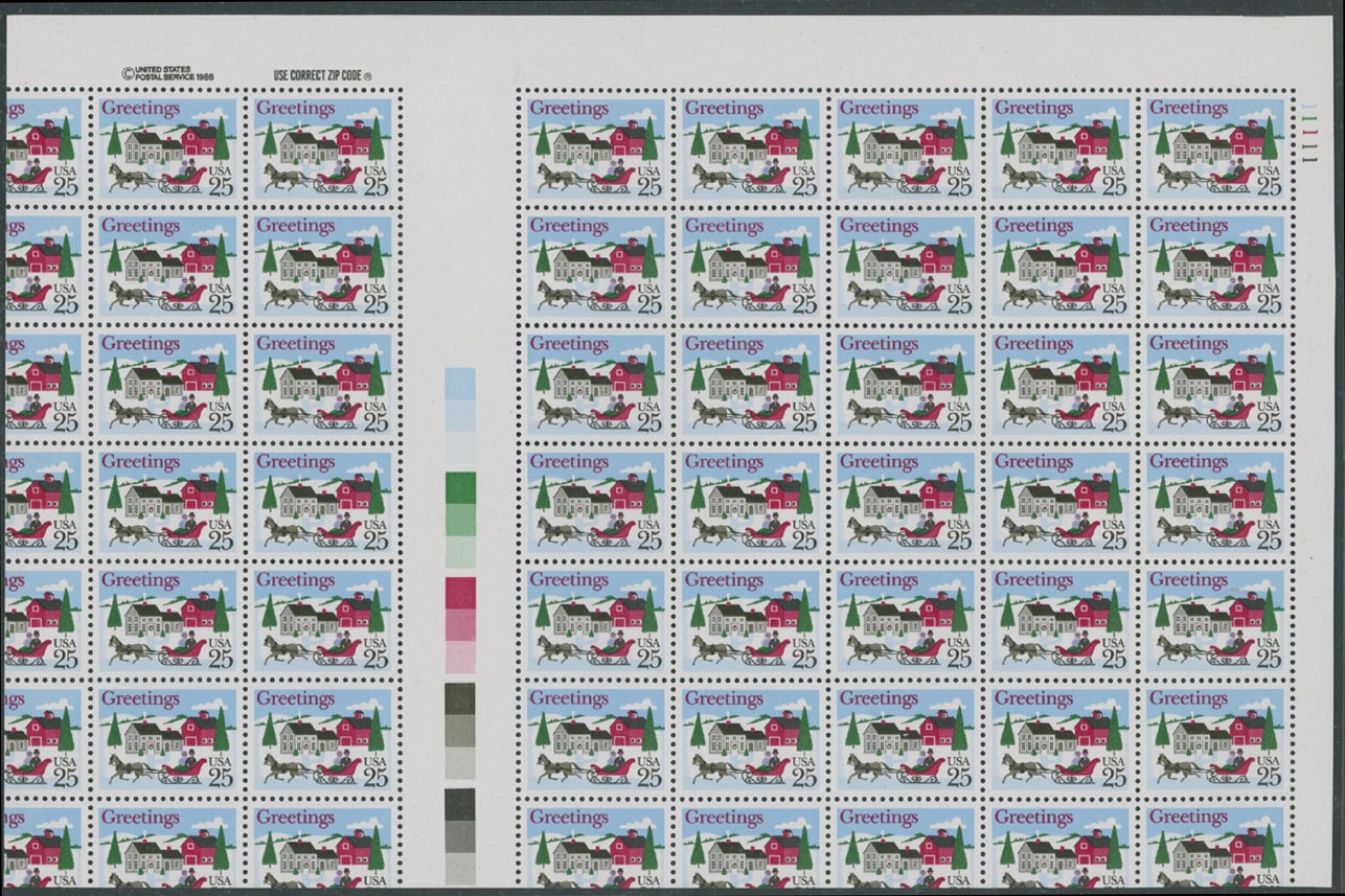 1988, Christmas, Sleigh Village Scene, 25c multicolored, top right corner sheet margin plate No.11111 block of 42 (7×6) with vertical gutter and parts of adjoining stamps at left and bottom, caused because the press sheet was turned sideways through the cutter, full OG, NH, VF, C.v. $1,350 as six gutter pairs, Est. $800-$900, Scott #2400 var