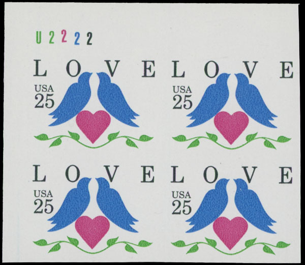 1990, Love, 25c multicolored, top left corner sheet margin plate No. U2222 imperforate block of four, full OG, NH, VF, C.v. $1,100 as two pairs, Est. $500-$600 , Scott #2440a