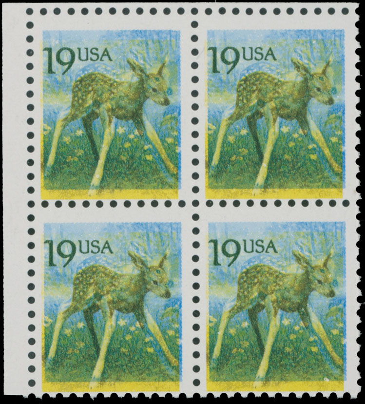 1991, Fawn 10c multicolored, red color omitted, top left margin block of four, full OG, NH, VF, C.v. $1,000 as singles, Est. $400-$500 , Scott #2479b
