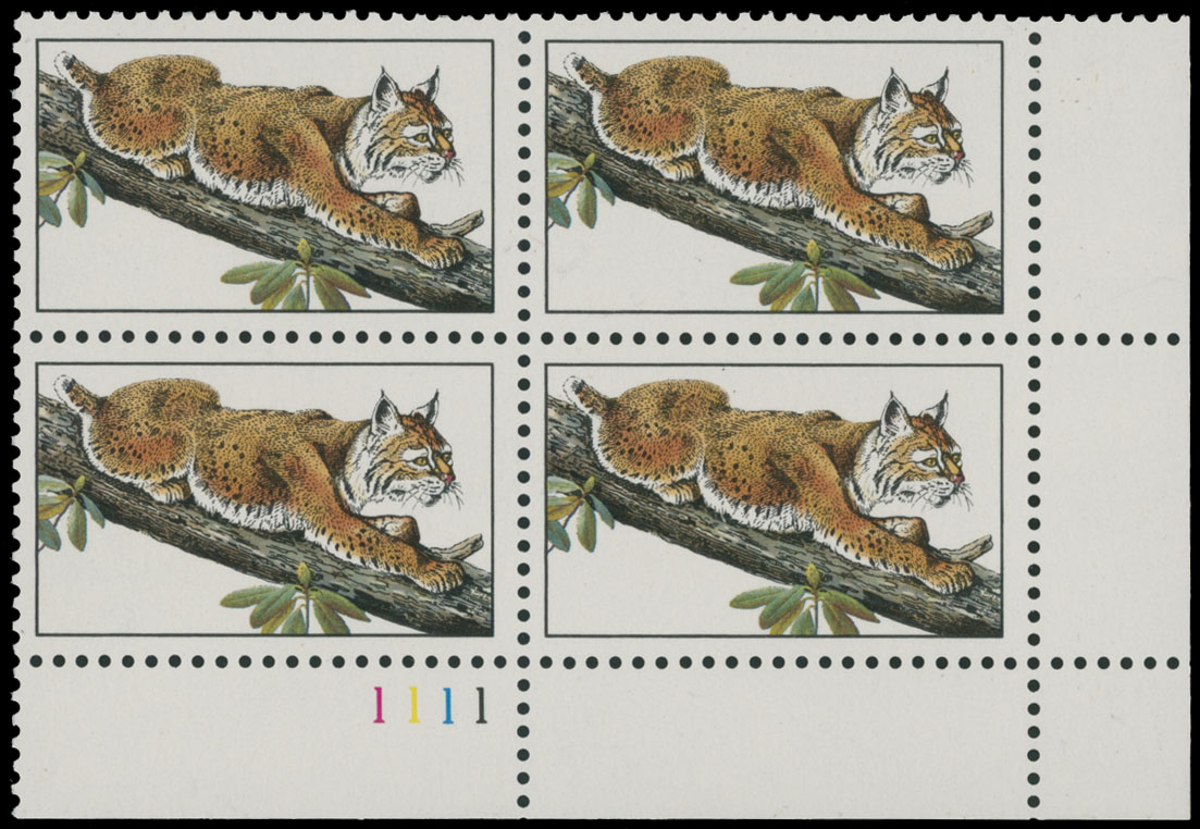1990, Bobcat ($2) multicolored, black (engraved – $2 USA) omitted, bottom right corner sheet margin plate No.1111 block of four, full OG, NH, VF, C.v. $800 as singles, Est. $400-$500 , Scott #2482a