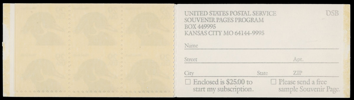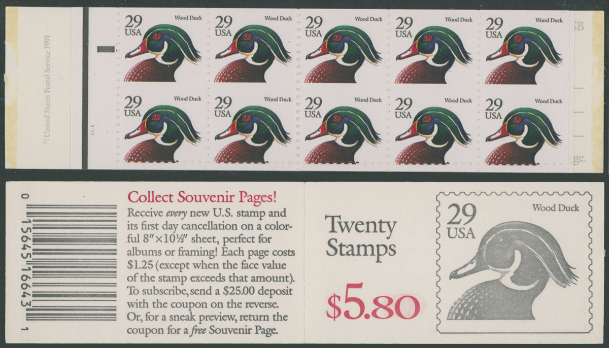 1991, Wood Duck, $5.80 intact booklet, containing 29c stamps in two panes of ten, plate No.1111, imperforate between stamps with straight edge at top, nice condition, full OG, NH, VF, Scott #BK174b, C.v. $1,750 as two panes with error, Est. $800-$1,000, Scott #2484g