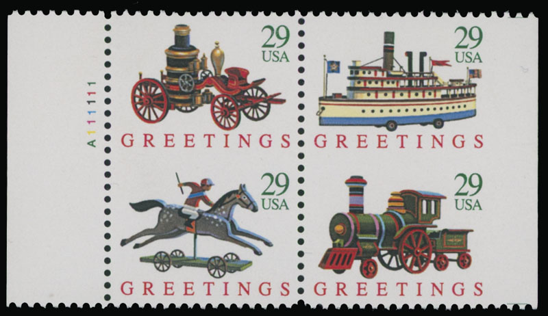 1992, Christmas Toys, proof se-tenant booklet pane of four 29c stamps with wrong layout (stamps from the bottom placed at the top), imperforate horizontally between stamps, selvage at left with plate No. A11111, full OG, NH, VF, C.v. $1,200, Est. $500-$600, Scott #2718a Pd