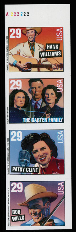 1993, American Music, 29c multicolored, imperforate vertical se-tenant booklet proof pane of four, finished design, plate No.222222 at top margin, full OG, NH, VF and rare, C.v. $1,500, Est. $600-$700 , Scott #2778a Pg