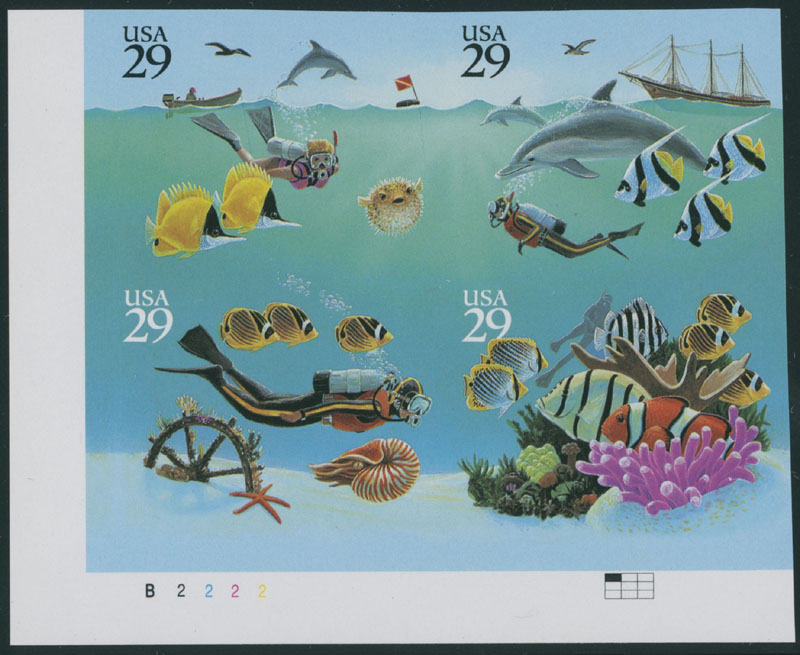 1994, Wonders of the Sea, 29c x4 multicolored, bottom left corner sheet margin imperforate se-tenant block of four, plate No.B2222, full OG, NH, VF, C.v. $350, Est. $250-$300 , Scott #2866a