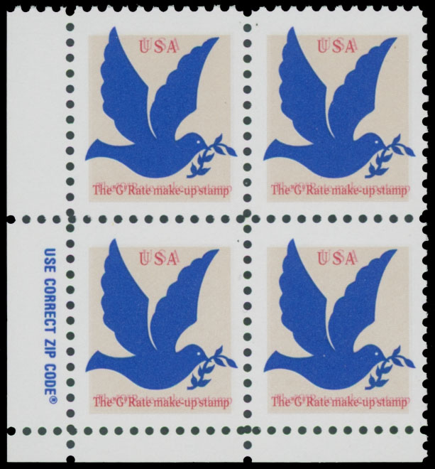 1991, the ”G” Rate make up stamp, (3c) with double impression of red color, bottom left corner sheet margin block of four, ZIP imprint at left selvage, full OG, NH, VF, C.v. $700++, Est. $300-$350 , Scott #2877b