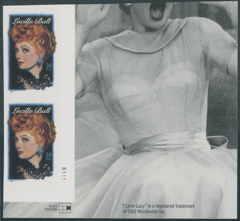 2001, Lucille Ball, 34c multicolored, vertical pair of self- adhesive stamps with plate No. B1111 and margin at right, die cutting omitted, backing paper intact, VF, C.v. $700, Est. $400-$500 , Scott #3523a