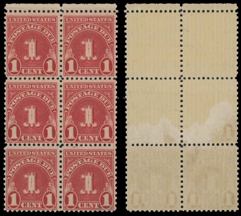 1931, Numerals, 1c scarlet, wet printing, design size 19×22,5 mm, top margin block of six (2×3), upper block of four printed on double paper, full OG, NH, VF, Est. $200- $250 , Scott #J80a var
