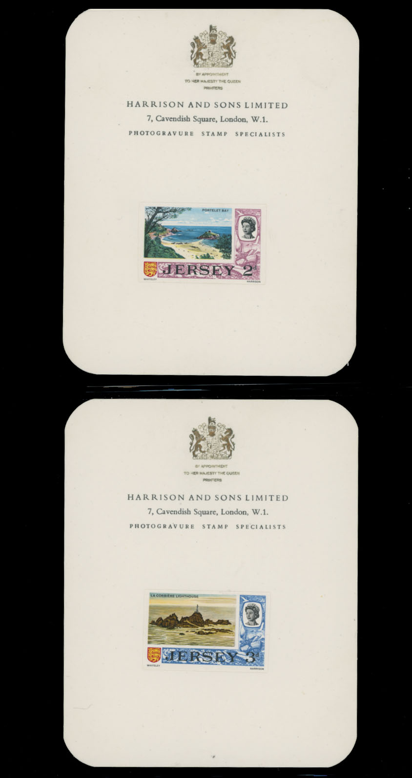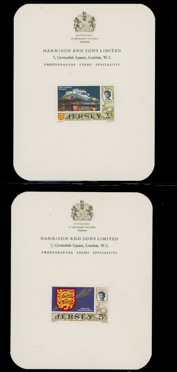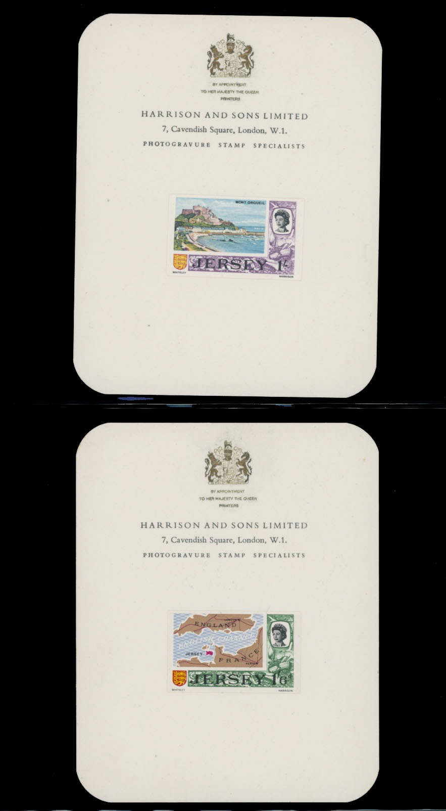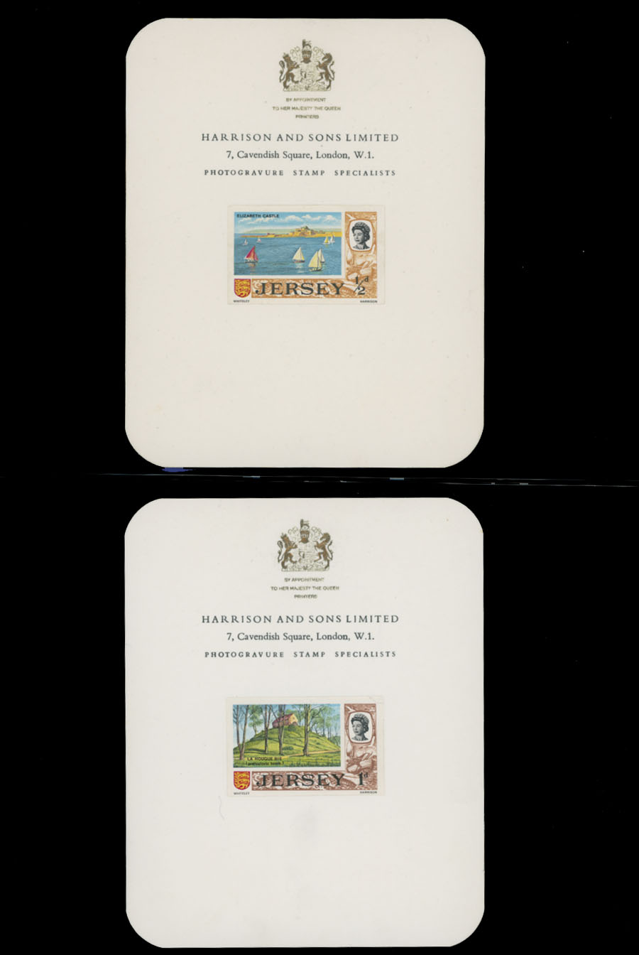 1969, Queen Elizabeth II definitive issue, imperforate proofs mounted on Harrison and Sons Limited presentation cards (½p-1s9p) or States of Jersey ”With Compliments…” cards (5s, 10s, and £1), set of 14 (less 2s6p value), fresh and nice unit, only a few produced, VF and rare, Est. $1,000-$1,200, Scott #7/21
