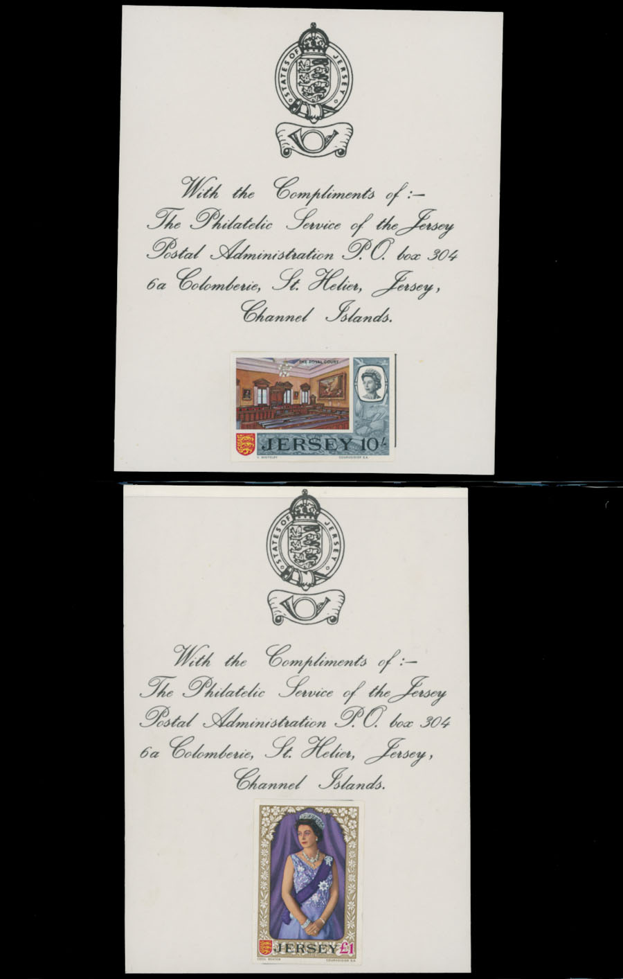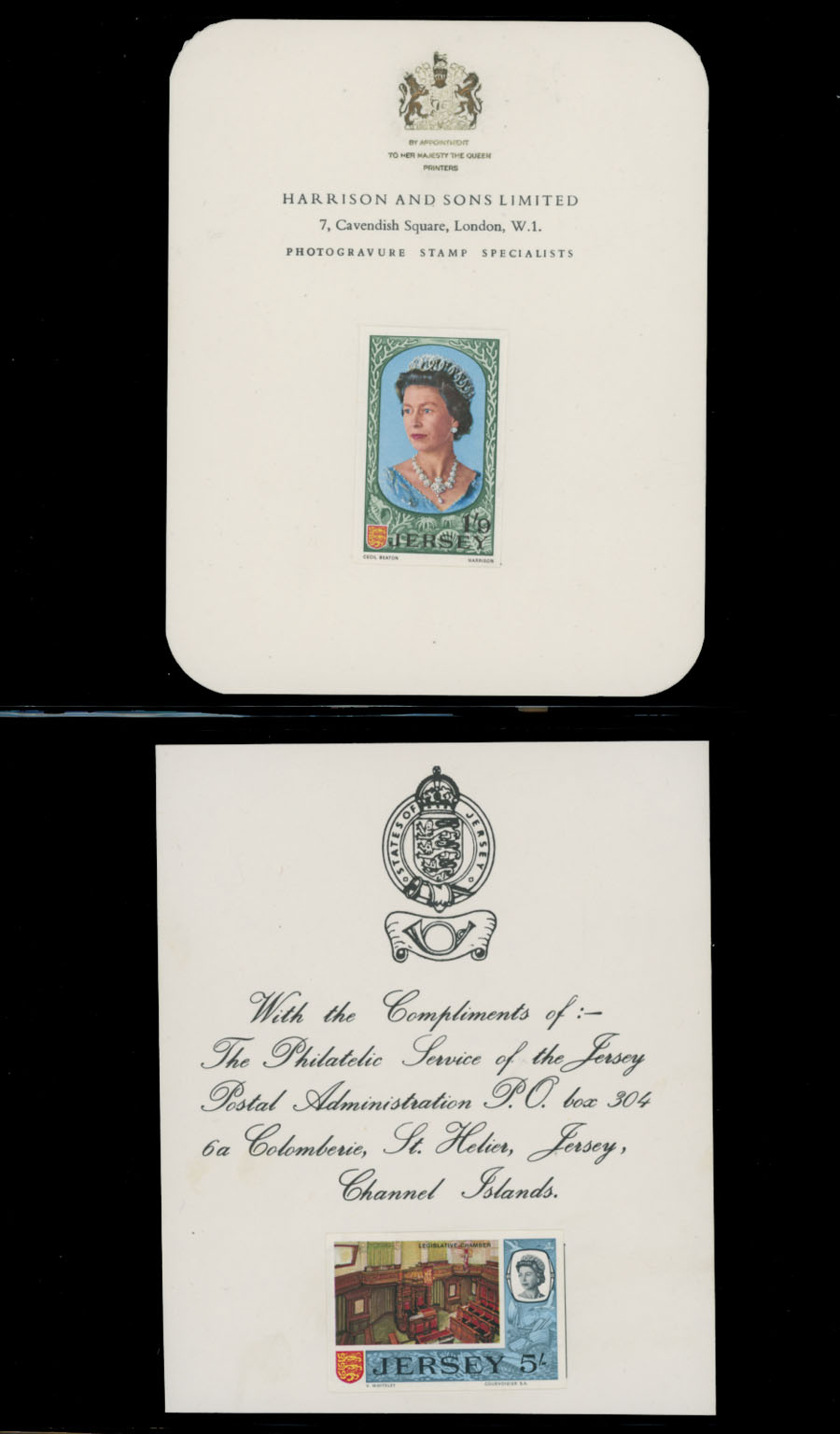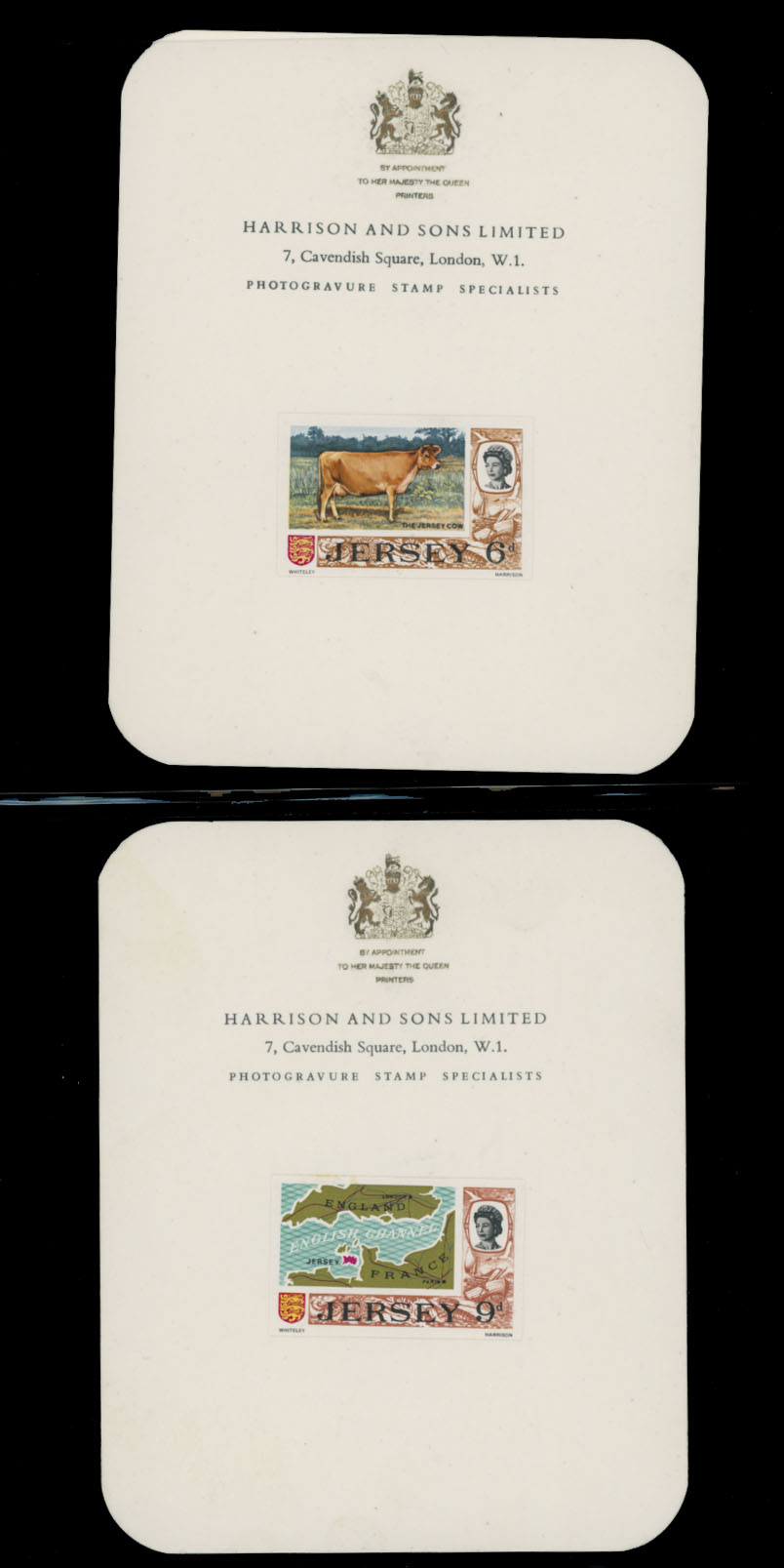 1969, Queen Elizabeth II definitive issue, imperforate proofs mounted on Harrison and Sons Limited presentation cards (½p-1s9p) or States of Jersey ”With Compliments…” cards (5s, 10s, and £1), set of 14 (less 2s6p value), fresh and nice unit, only a few produced, VF and rare, Est. $1,000-$1,200, Scott #7/21