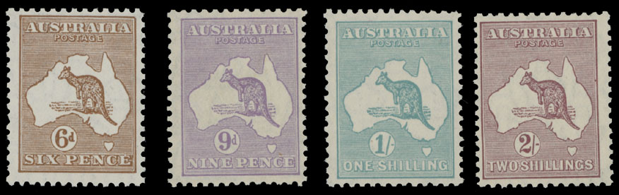 1929, Kangaroo 6p brown, 9p violet, 1s blue green and 2s maroon, all are die II, set of four values printed on paper with Multiple Small Crown and A watermark, full OG, NH (!), F/VF, C.v. $428, SG #107/110, C.v. £295 as hinged, Est. $300-$400 , Scott #96-99