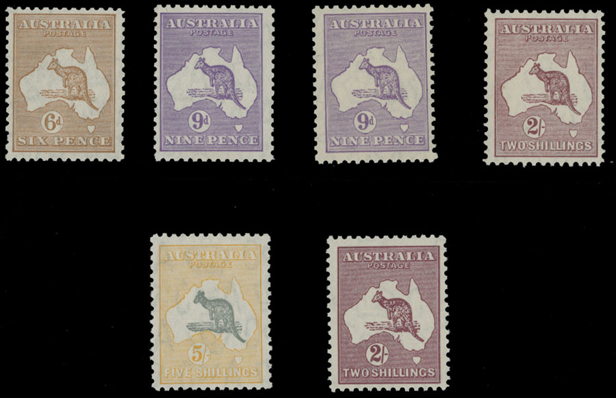 1932-45, Kangaroo 6p brown, two shades of 9p violet, 2s maroon and 5s yellow and gray, die II, Multiple Small Crown and C of A Watermark, in addition 6p re- engraved stamp from 1945, full OG, all are NH, except 5s – LH, mostly VF, C.v. $386, SG #132/35, 212, £331 as hinged, Est. $200-$250, Scott #121/26, 206