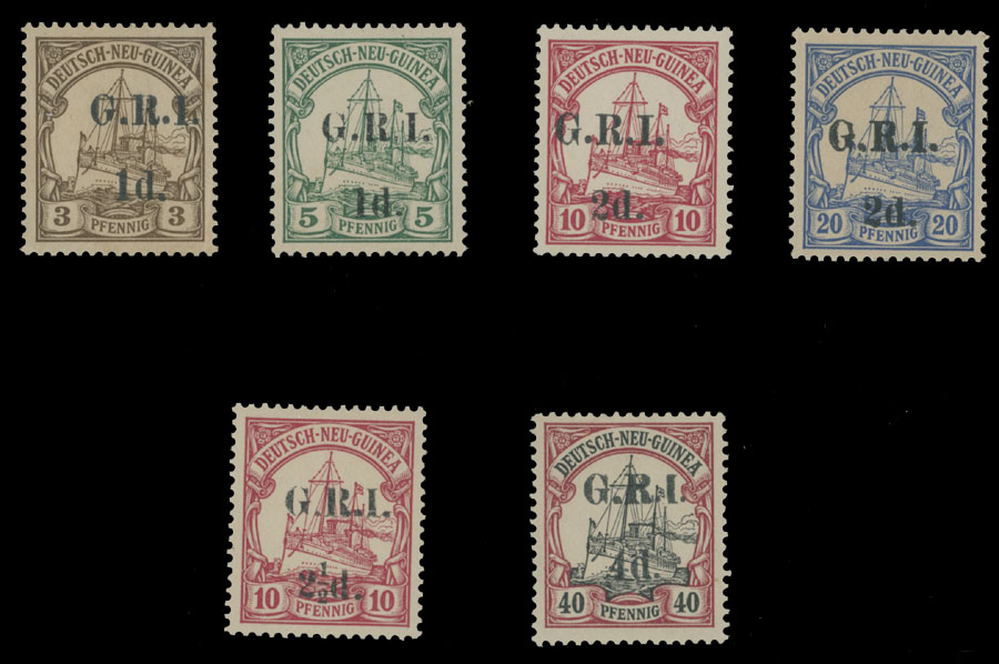 1914, surcharge (2nd setting) ”G.R.I.” and new denominations, 1d/3pf, 1d/5pf, 2d/10pf, 2d/20pf, 2½d/10pf and 4d/40pf, full/large part of OG, VF, some with expert’s signs on reverse, No.24 with APEX certificate, all guaranteed genuine, C.v. $708, SG #16/24, C.v. £640, Est. $400-$500, Scott #16/24