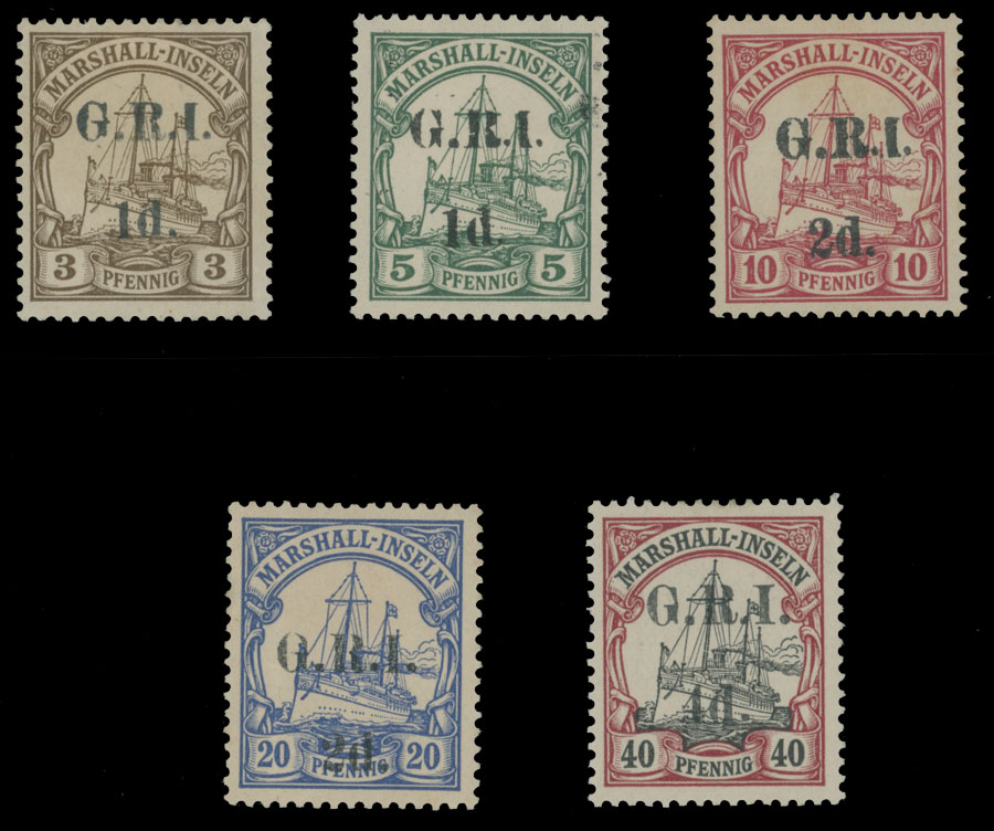 1914, surcharge ”G.R.I.” and new denominations 1d/3pf, 1d/5f, 2d/10pf, 2d/20pf and 4d/40pf, set of five values, full OG, mainly LH, VF, C.v. $488, SG #50/53, 56, C.v. £444, Est. $300-$350 , Scott #30-33, 36
