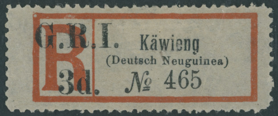 1915, surcharge ”G.R.I. 3d” on serifed Kawieng registered label, unused, no gum, VF, C.v. $275, SG #42, C.v. £250, Est. $200-$250 , Scott #46h