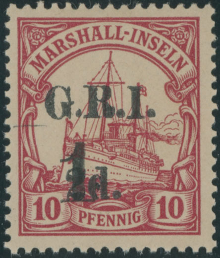 1915, large 1(d) surcharge over ”G.R.I. 2d” on 10pf carmine, full OG, NH, VF, C.v. $220, SG #63, C.v. £200, both values for hinged stamps, Est. $200-$250 , Scott #51