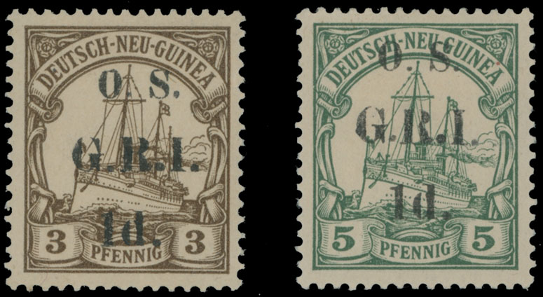 OFFICIAL STAMPS: 1915, overprints ”o.s.” over surcharges (2nd setting) ”G.R.I. 1d” on 3pf brown and 5pf green, complete set of two, full OG, LH or previously hinged, VF, C.v. $148, SG #O1-2, C.v. £135, Est. $120-$150 , Scott #O1-2