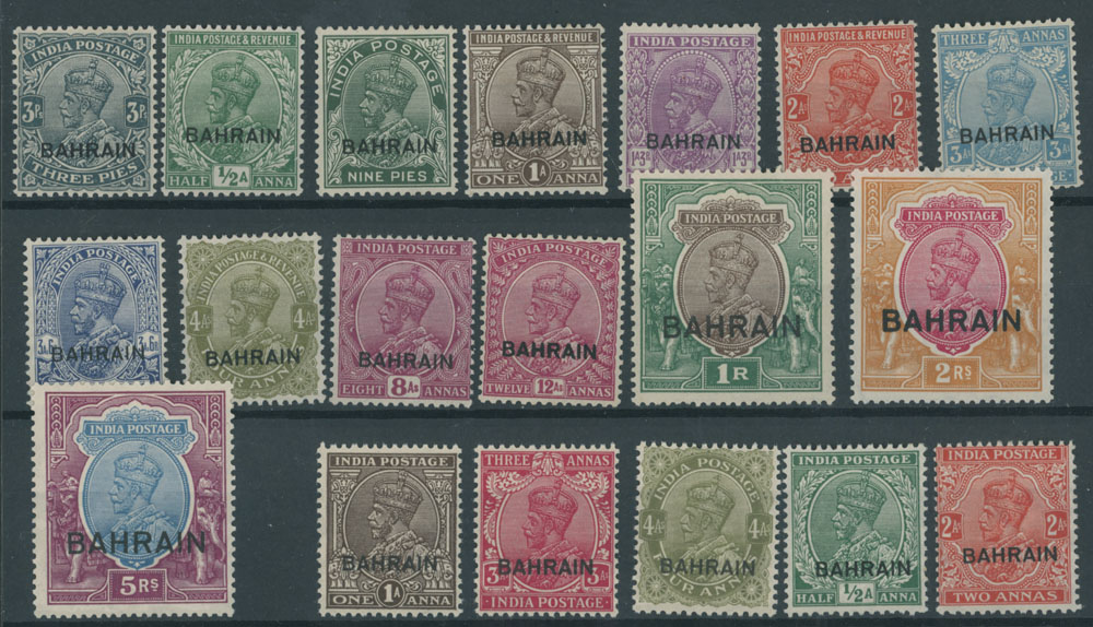 1933-37, King George V, stamps of India with black overprint ”BAHRAIN”, 3p-5r, 1a-4a, ½a, 2a, three complete issues, full OG, NH (several values of the main set and all #15-19) or VLH, F/VF, C.v. $700, SG #1/14,15/19, £370 as hinged, Est. $400-$500, Scott #1-14, 15‑19
