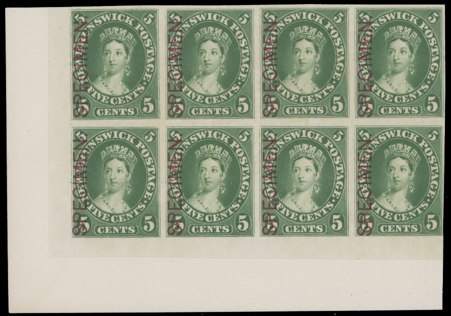 1860, Queen Victoria, imperforate plate proof of 5c yellow green, printed on India paper and mounted on card, bottom left corner sheet margin block of eight (4×2), red vertical overprint ”Specimen”, type B, no gum as produced, VF, Unitrade #8Pii, C.v. CAD$400++, Est. $200-$250, Scott #8