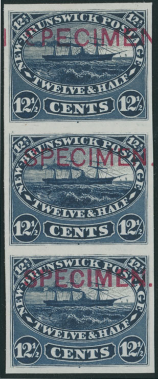 1860, Steamship, imperforate plate proof of 12½c in dark blue, vertical strip of three printed on India paper and mounted on card, red horizontal overprint ”Specimen” of types D-B-C, penciled positions 45/55/65, no gum as issued, VF, Unitrade #10 Pv, ii, iii, C.v. CAD$580, including 100% premium for 3 types in se- tenant, Est. $200-$250, Scott #10