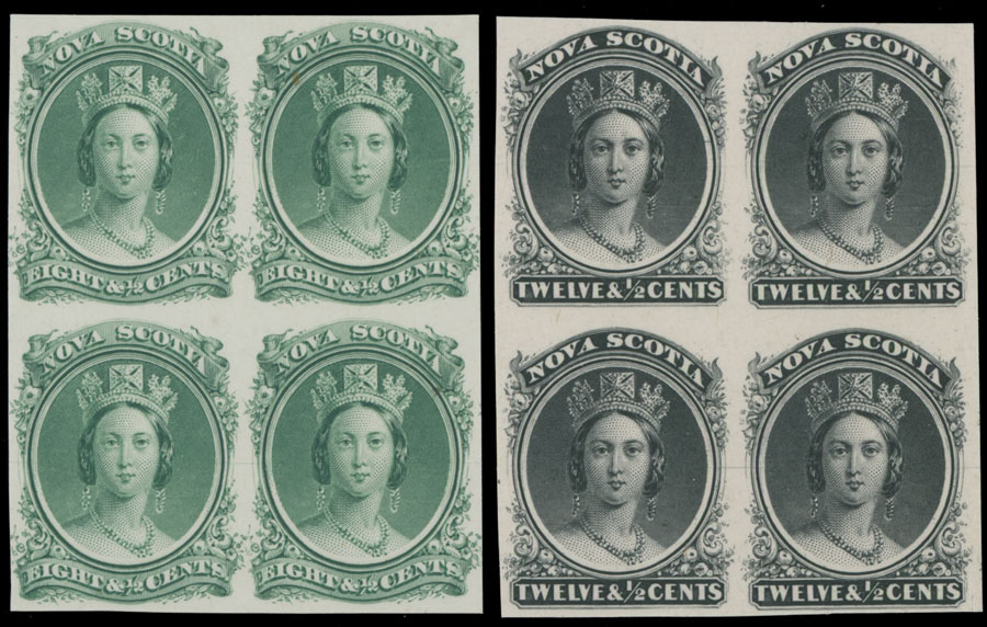 1860-63, Queen Victoria, imperforate plate proofs of 8½c in dark green and 12½c in black, blocks of four printed on India paper and mounted on cards, no gum as issued, VF, Unitrade #11Pi, 13P, C.v. CAD$540, Est. $200-$250 , Scott #11, 13