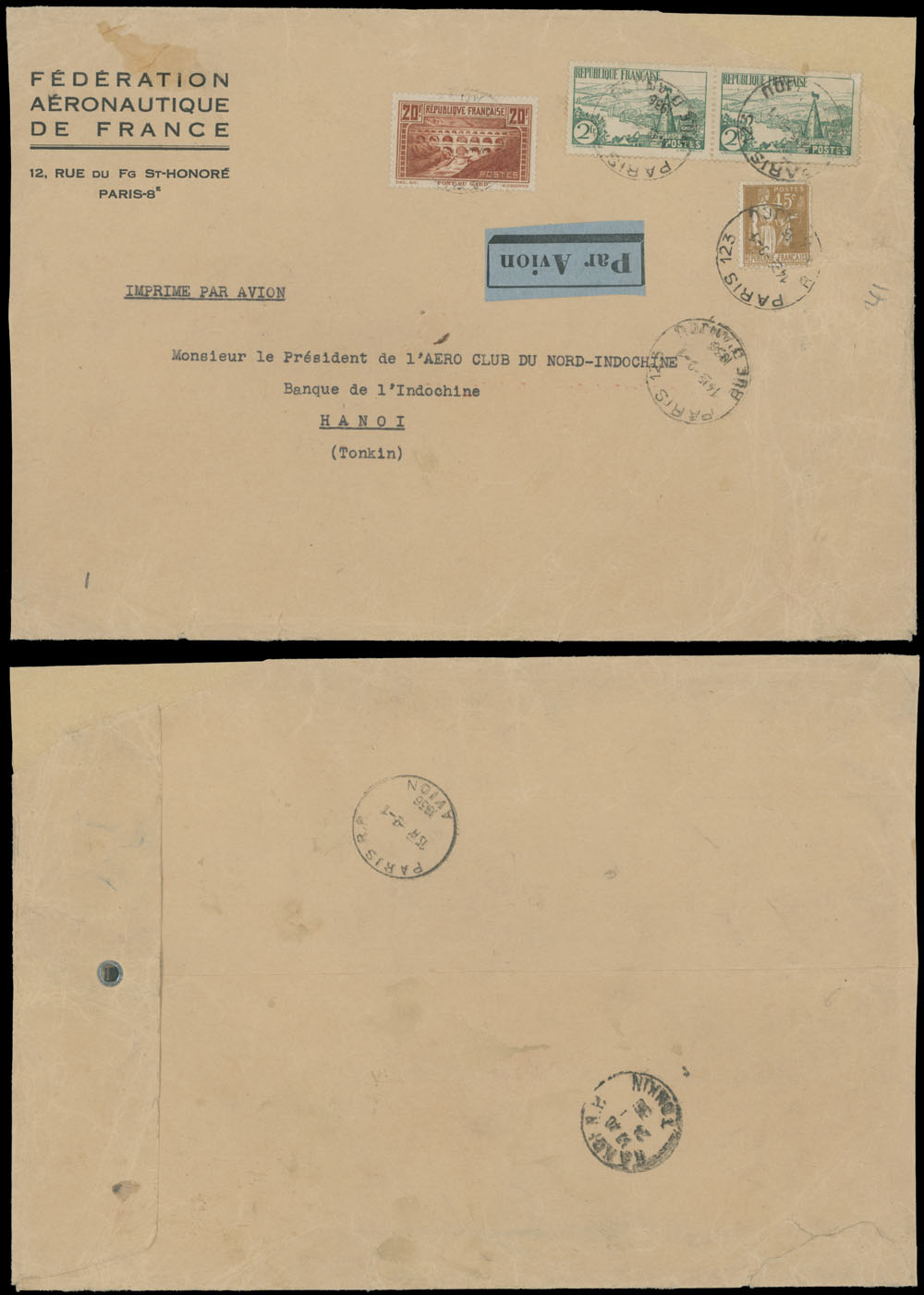 1936 (January 9), Air Orient Flight pre-printed cover of the French Aeronautics Federation, sent from Paris to Hanoi, franked by four stamps (without perfin), Hanoi ”24.I.36” arrival marking on reverse, some cover repairs at top right, still fine and rare item, Est. $200-$225, Scott #254A, 299