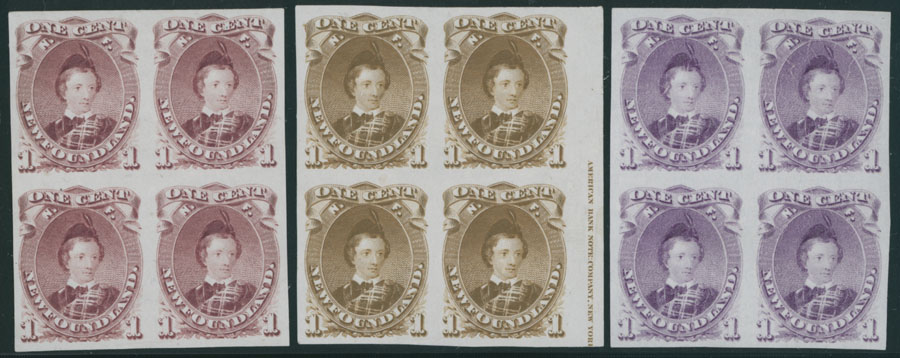1871, Prince Edward, imperforate plate proof of 1c in brown violet, and two trail color proofs of 1c in yellow brown and violet, blocks of four printed on India paper, one with ABN Co. imprint on the edge, no gum as issued, NH, VF, Unitrade #32Ap, 32ATCii, vi, C.v. CAD$1,120, Est. $400-$500, Scott #32A