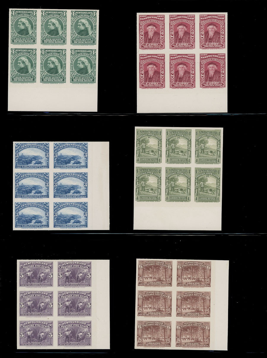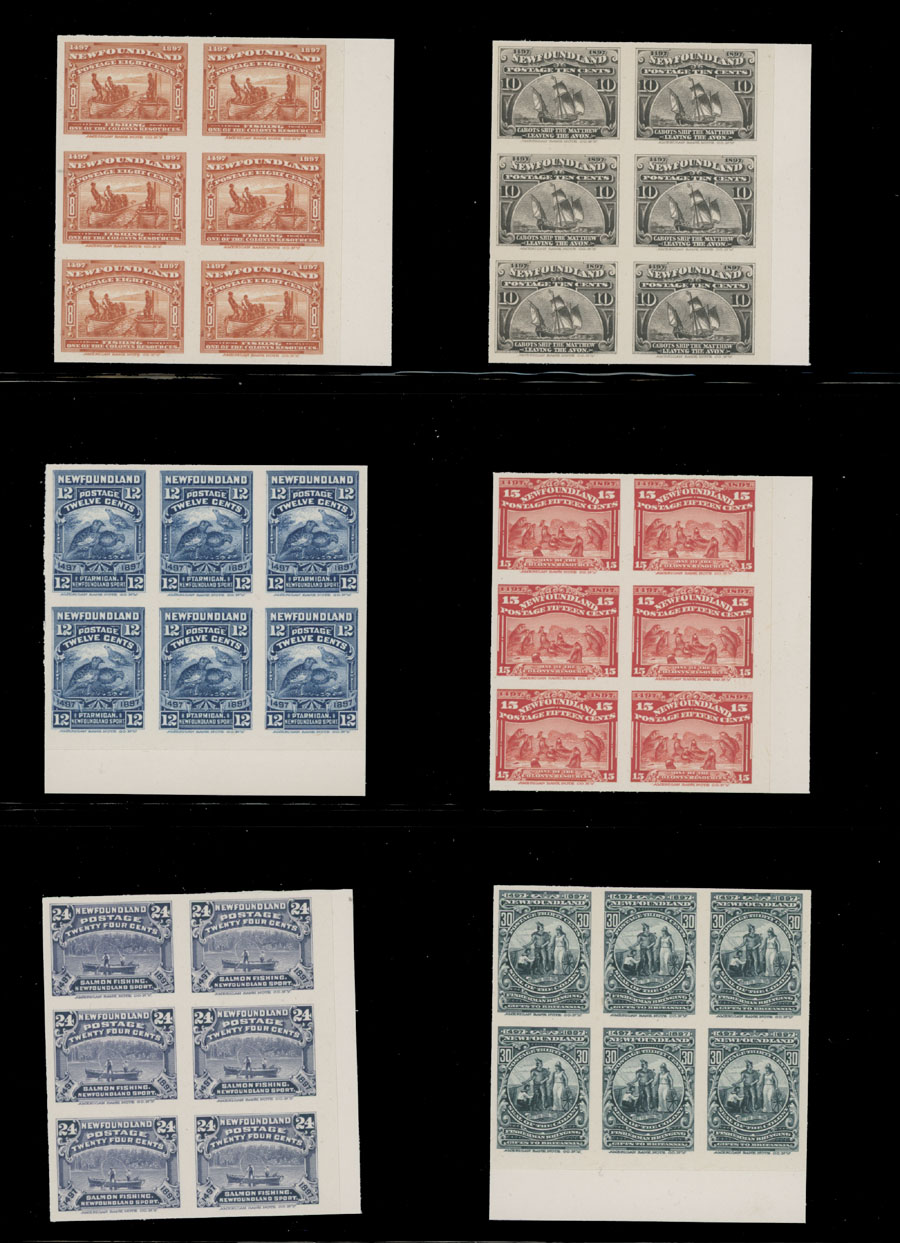 1897, imperforate plate proofs of 1c-60c in issued colors on India paper mounted on cards, complete set of 14 in sheet margin blocks of six, no gum as issued, VF, Unitrade C.v. CAD $4,650++, Est. $2,000-$2,500, Scott #61-74