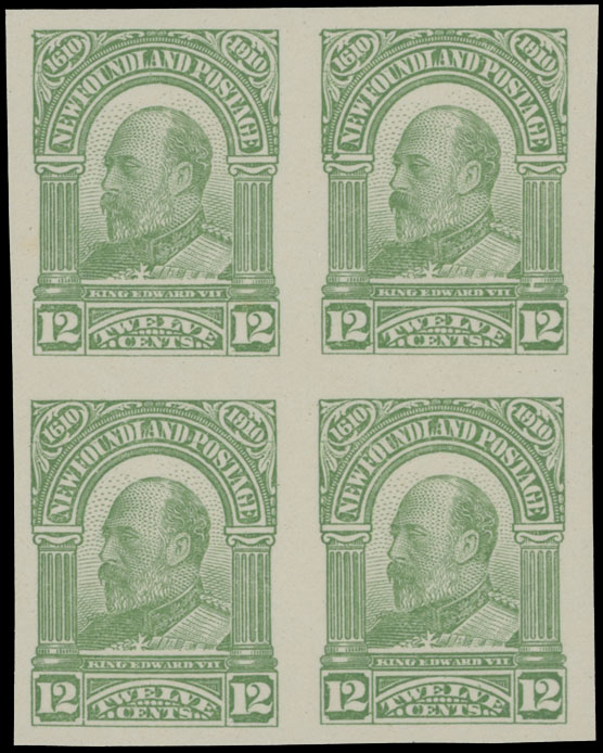1910, King Edward VII, imperforate trail color proof of 12c in yellow green, block of four printed on white paper without watermark, full OG, NH, VF and rare, NSSC 88c, C.v. US$1,200 as singles, Est. $600-$700 , Scott #96