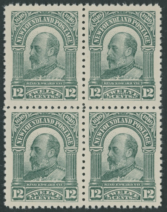 1910, King Edward VII, trail color proof of 12c in bluish green, perforation L11, block of four printed on white paper without watermark, full OG, NH, VF and rare, NSSC 88d, C.v. US$2,040 as singles, Est. $800-$900 , Scott #96