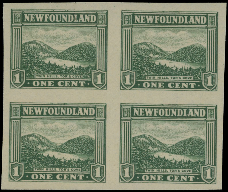 1923-24, Twin Hills, 1c gray green, imperforate block of four, full OG, NH, VF and scarce multiple with gum, C.v. $500, Unitrade C.v. CAD$750 as two pairs, Est. $300- $400 , Scott #131b