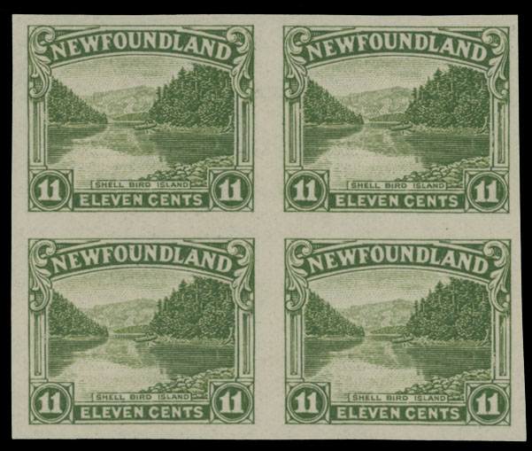1923-24, Shell Bird Island, 11c olive green, imperforate block of four, full OG, NH, VF and scarce multiple on gummed paper, Unitrade C.v. CAD$900 as two pairs, Est. $400-$500 , Scott #140a