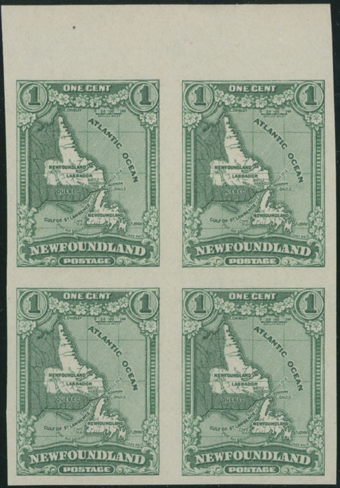 1929-31, Second issue, Map of Newfoundland, 1c green, imperforate top sheet margin block of four, no gum as issued, NH, VF, Unitrade #163c, C.v. CAD$320 as two pairs, Est. $150-$180 , Scott #163 var