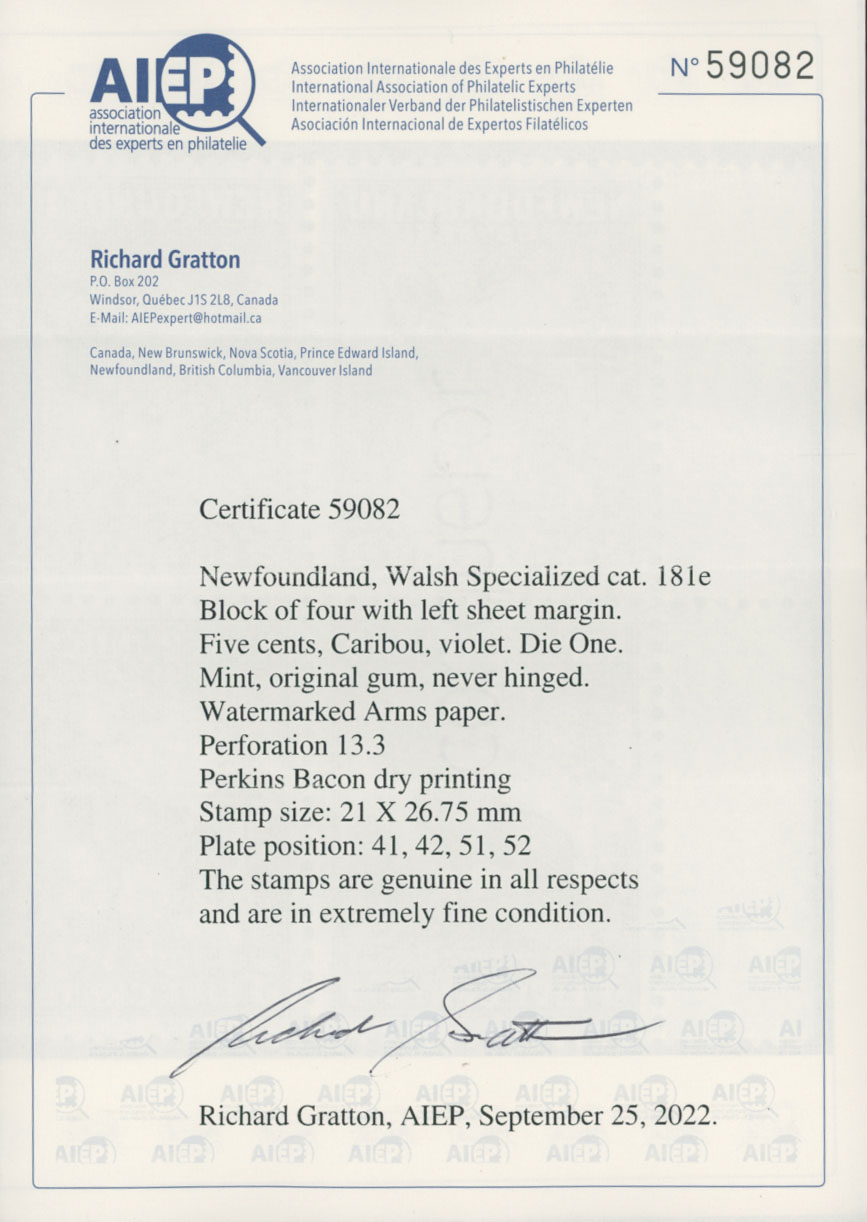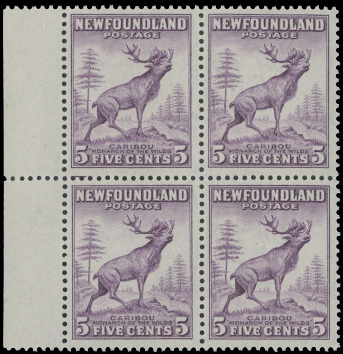 1932-37, Caribou, 5c violet, Die I, left sheet margin block of four with comb perforation 13.3×13.3, Perkins Bacon dry printing, stamp size 21×26.75mm, nicely centered, full OG, NH, VF and rare multiple, R. Gratton certificate, Walsh NSSC #181e, C.v. US$3,000 as singles, Est. $1,000-$1,200, Scott #191 var