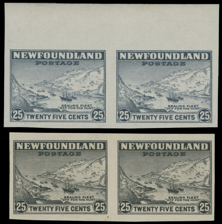 1932-37, Sealing Fleet, 25c bluish gray, top sheet margin imperforate pair, and imperforate plate proof of 25c in black, horizontal pair printed on wove paper without watermark, full OG or no gum as issued, NH, VF, Unitrade C.v. CAD$450 plus NSSC 191g, C.v. US$460as singles, Est. $300-$350, Scott #197, a