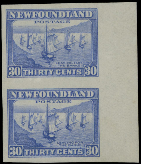 1932-37, Fishing Fleet, 30c ultramarine, right sheet margin vertical imperforate pair, full OG, LH (top stamp, bottom – NH), C.v. $850, VF and scarce, Unitrade C.v. CAD$1,200, Est. $400-$500 , Scott #198a