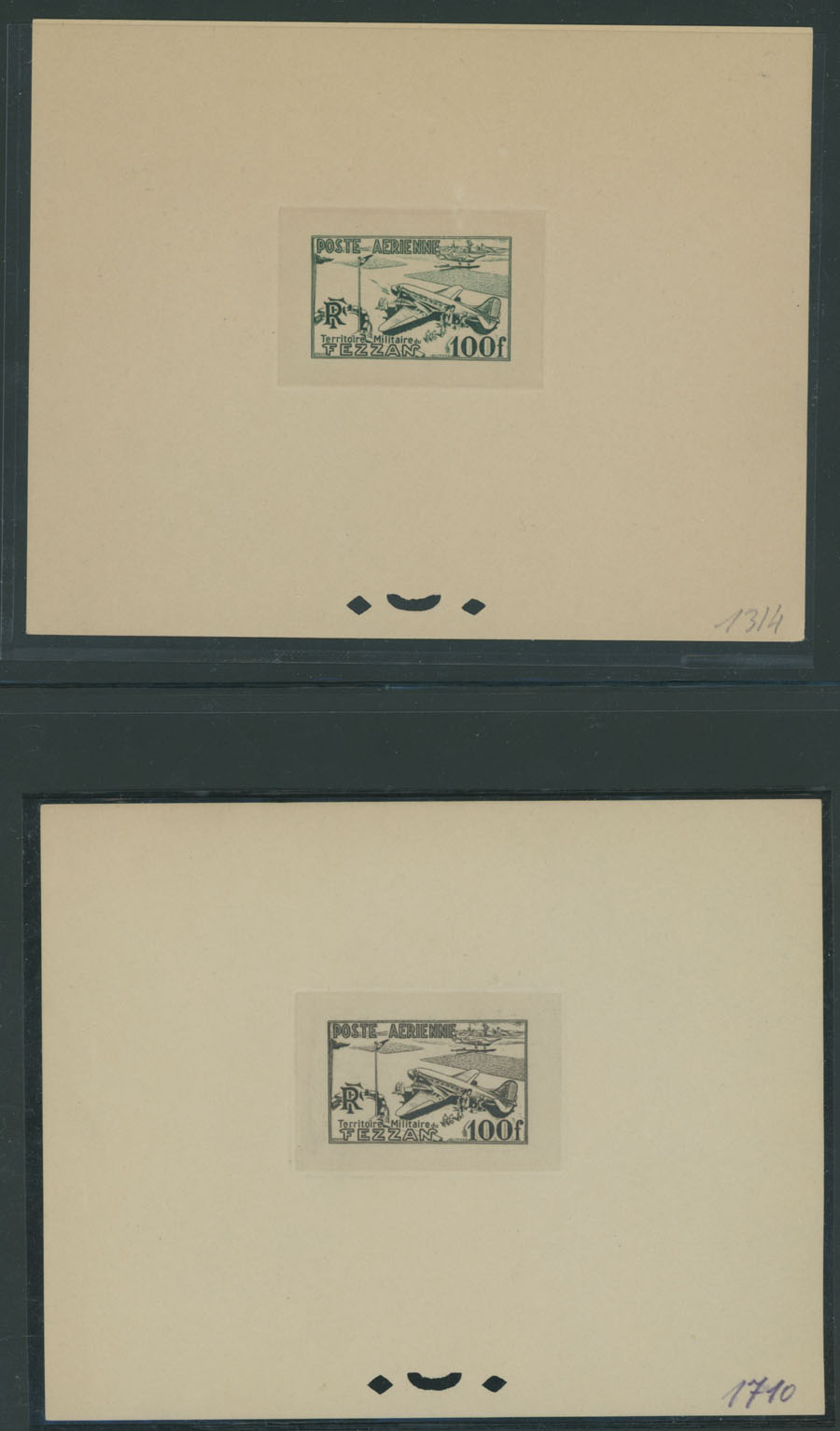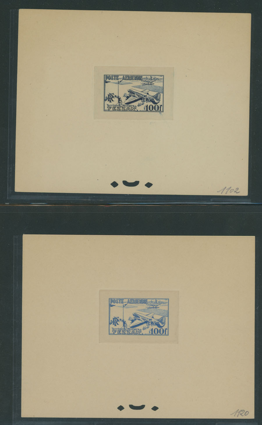 1948, View of Airport 100fr, four die sunk color proof sheets with typical French punctures, but with manuscript numbers instead of the text, colors – ultra (No.1102), light blue (No.1120), dark green (No.1314) and dark brown (No.1710), approximate size140x110mm, no gum as produced, NH, VF and extremely rare, only a few printed of each color, Sassone #PA1, Est. $1,000-$1,200, Scott #2NC1