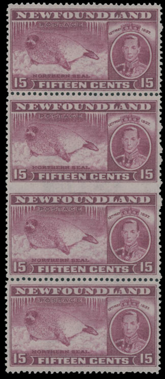 1937, Harp Seal, 15c claret, vertical strip of four, imperforate horizontally in the middle, full OG, NH, VF and very rare, C.v. $3,500, Unitrade C.v. CAD$5,000, Est. $2,500-$3,000 , Scott #239a