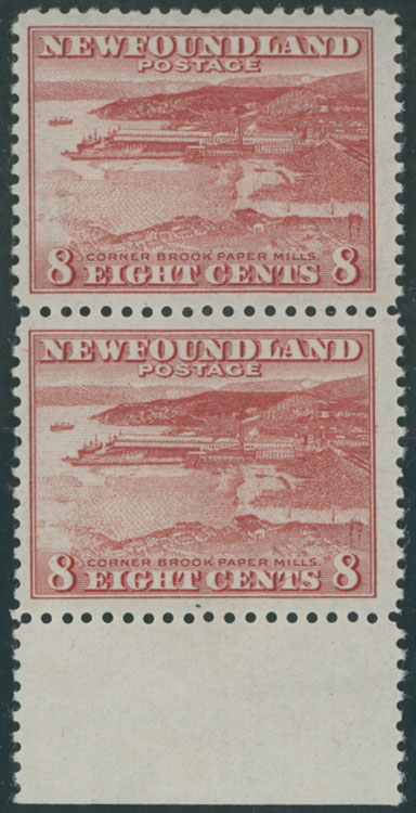 1941-44, Corner Brook Paper Mill, 8c red, bottom margin vertical pair, bottom stamp without watermark, full OG, NH, VF, Unitrade #259i, C.v. CAD$300, Est. $150-$180 , Scott #259 var