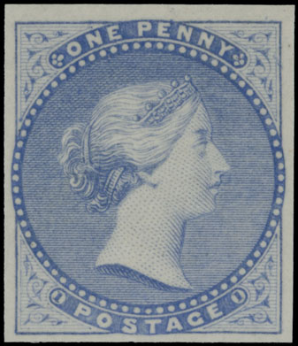 1851-59, Trial Essay by Bradbury, Wilkinson & Co., Queen Victoria 1p blue, four-side margin single printed on hard white bond paper, no gum as produced, VF, Minuse and Pratte #E-Bb, NSSC #CPEx2dp3, C.v. US$700, Est. $500-$600
