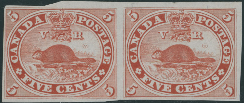 1867, Beaver 5c, imperforate plate proof in vermilion, horizontal pair printed on India paper, clipped margin at top left for security purposes, no gum as issued, NH, VF, Unitrade#15P, C.v. CAD$600, Est. $200-$250 , Scott #15