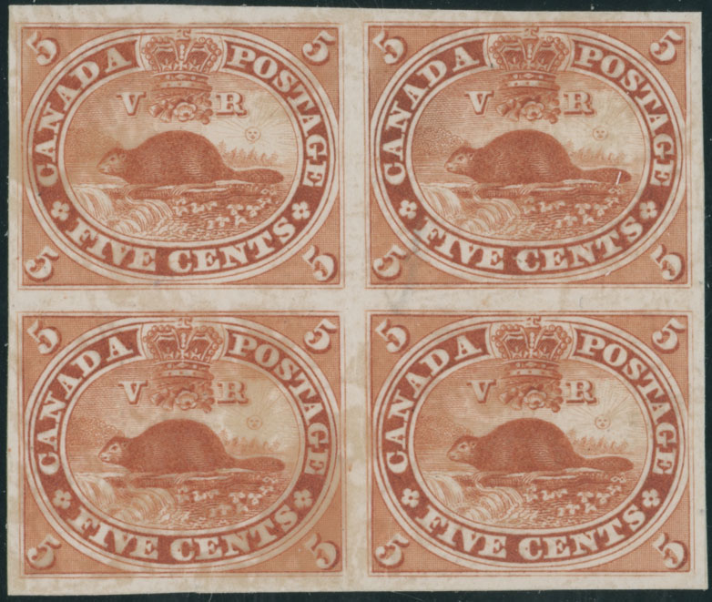1867, Beaver 5c, trial color proof in orange vermilion, block of four printed on India paper and mounted on card, no gum as issued, NH, VF, Unitrade#15TC, C.v. CAD $1,000, Est. $400-$500 . , Scott #15