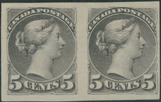 1891, 5c gray, horizontal imperforate pair, nice four-side margins, no gum as issued, NH, VF, C.v. $675, Unitrade C.v. CAD $900, Est. $400-$500 , Scott #42a