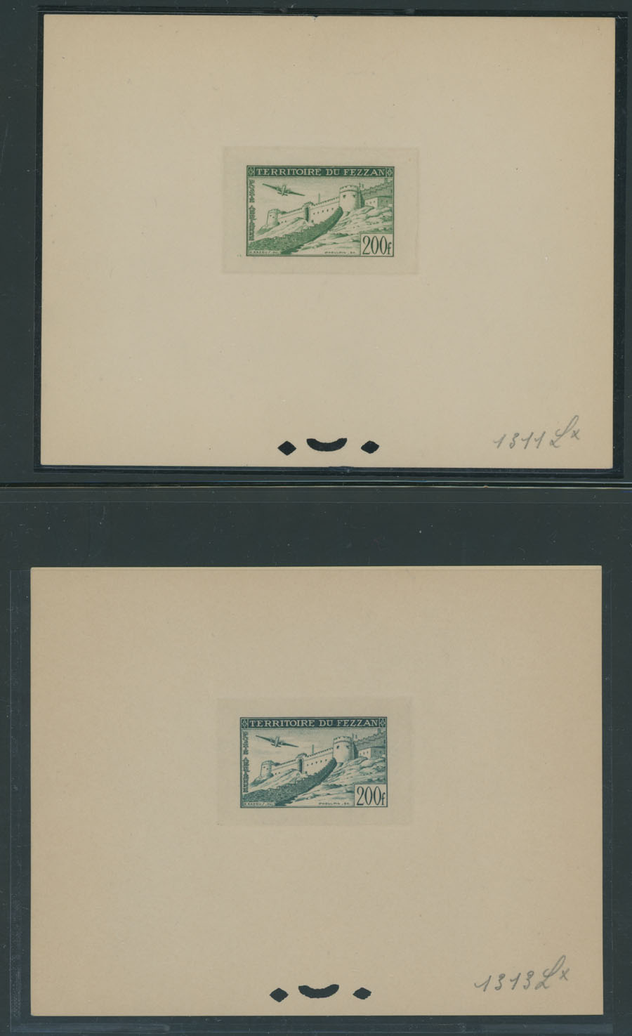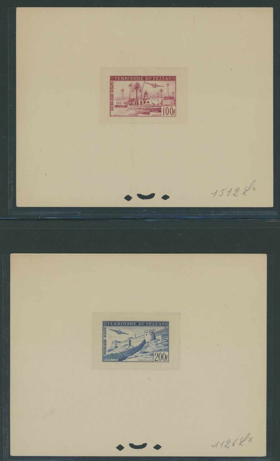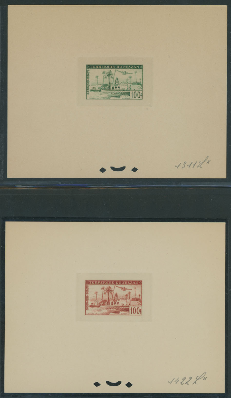 1951, Airplanes over Landscapes 100fr and 200fr, six color proof sheets with French punctures, but with manuscript numbers instead of the text, 100fr in green (No.1311), vermilion (No.1422) and carmine (No.1512); 200fr in blue (No.1126), green (No.1311) and blue green (No.1313), approximate size 140x110mm, no gum as produced, NH, VF and extremely rare, only a few produced in each color, Est. $1,500-$1,800, Scott #2NC3-4