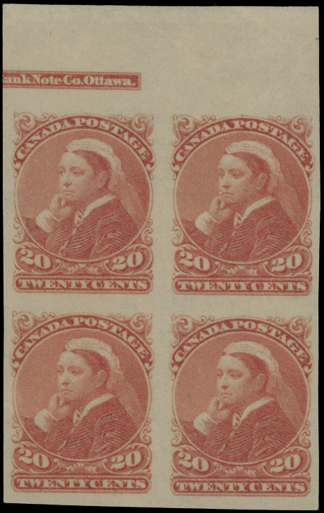 1893, Queen Victoria, Widow Weeds, 20c vermilion, top sheet imprint margin imperforate block of four, full OG, hinged on margin (away from stamps) and on bottom stamps, top stamps NH, VF and very rare multiple, C.v. $5,350++, Unitrade C.v. CAD$7,200 as two pairs, Est. $3,000-$3,500, Scott #46a