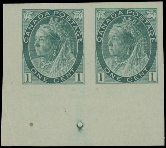 1898, 1c deep green, bottom left corner sheet margin horizontal imperforate pair, printed on vertical wove paper, no gum as issued, NH, VF and an eye-catching item, Unitrade C.v. CAD $1,600, Est. $500-$600 , Scott #75a
