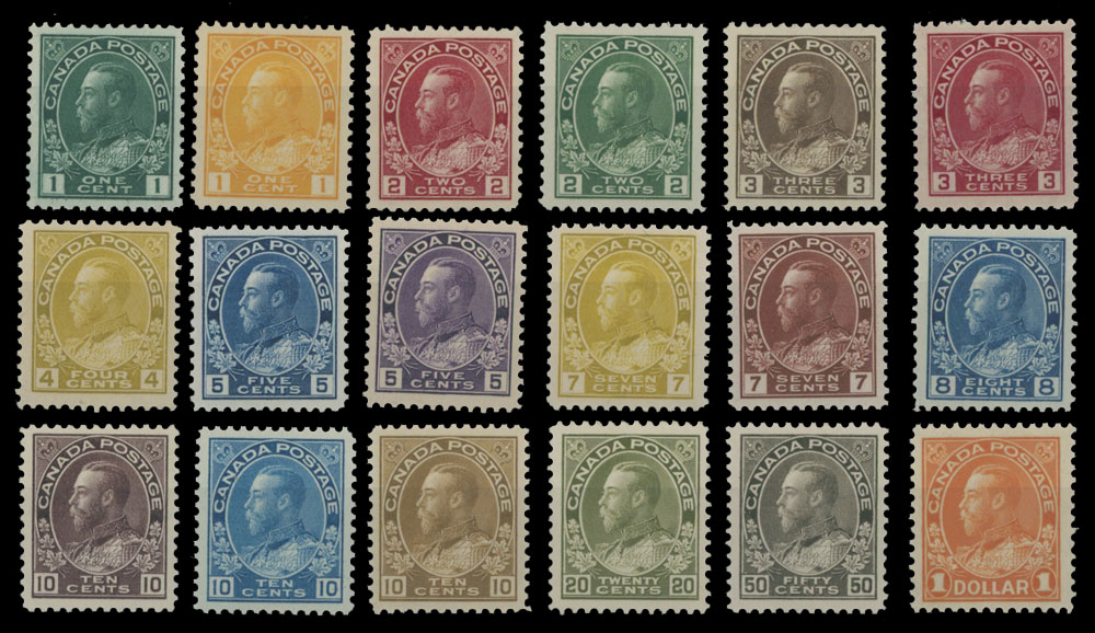 1911-25, 1c-$1, complete set of 18, strong colors and choice centering, full OG, NH, VF, C.v. $2,965, Unitrade C.v. CAD$5,445, Est. $1,000-$1,200 , Scott #104-22