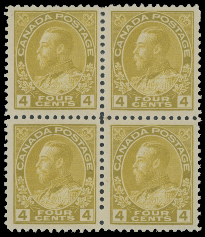 1922, 4c olive yellow, wet printing, block of four, full OG, NH, VF, C.v. $500++, Unitrade C.v. CAD$1,200 as singles, Est. $300-$350 , Scott #110b