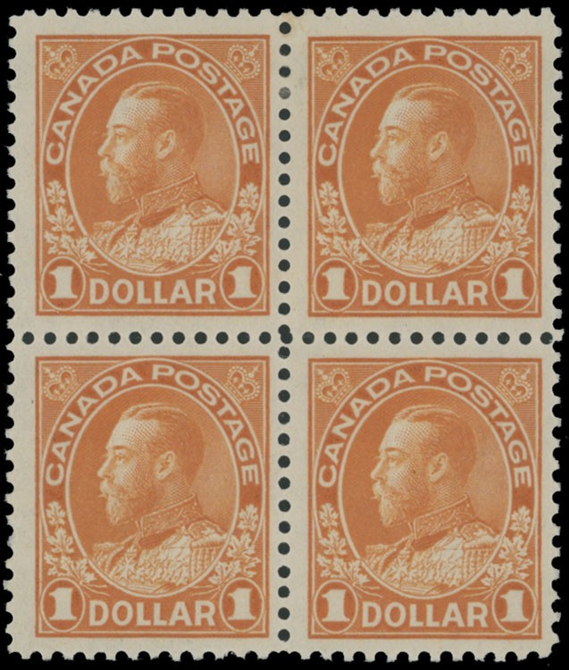 1923, $1 deep orange, dry printing, block of four, strong color, full OG, NH or LH (top stamps), VF, C.v. $600++, Unitrade C.v. CAD960 as singles, Est. $200-$250 , Scott #122