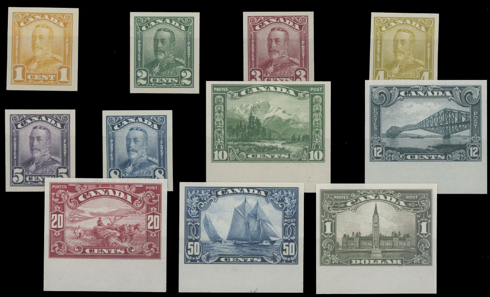 1928-29, imperforate plate proofs in issued colors of 1c- $1, complete set of 11 printed on India paper and mounted on cards, high values with bottom margins, nice looking unit, no gum as issued, NH, VF, Unitrade C.v. CAD $2,500, Est. $800-$1,000 , Scott #149-59